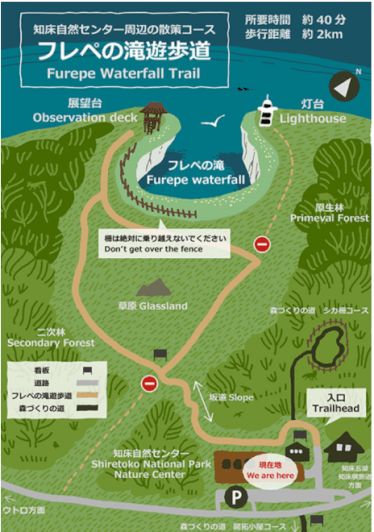 「知床自然センター」パンフレット、フレペの滝遊歩道の地図で確認してください。